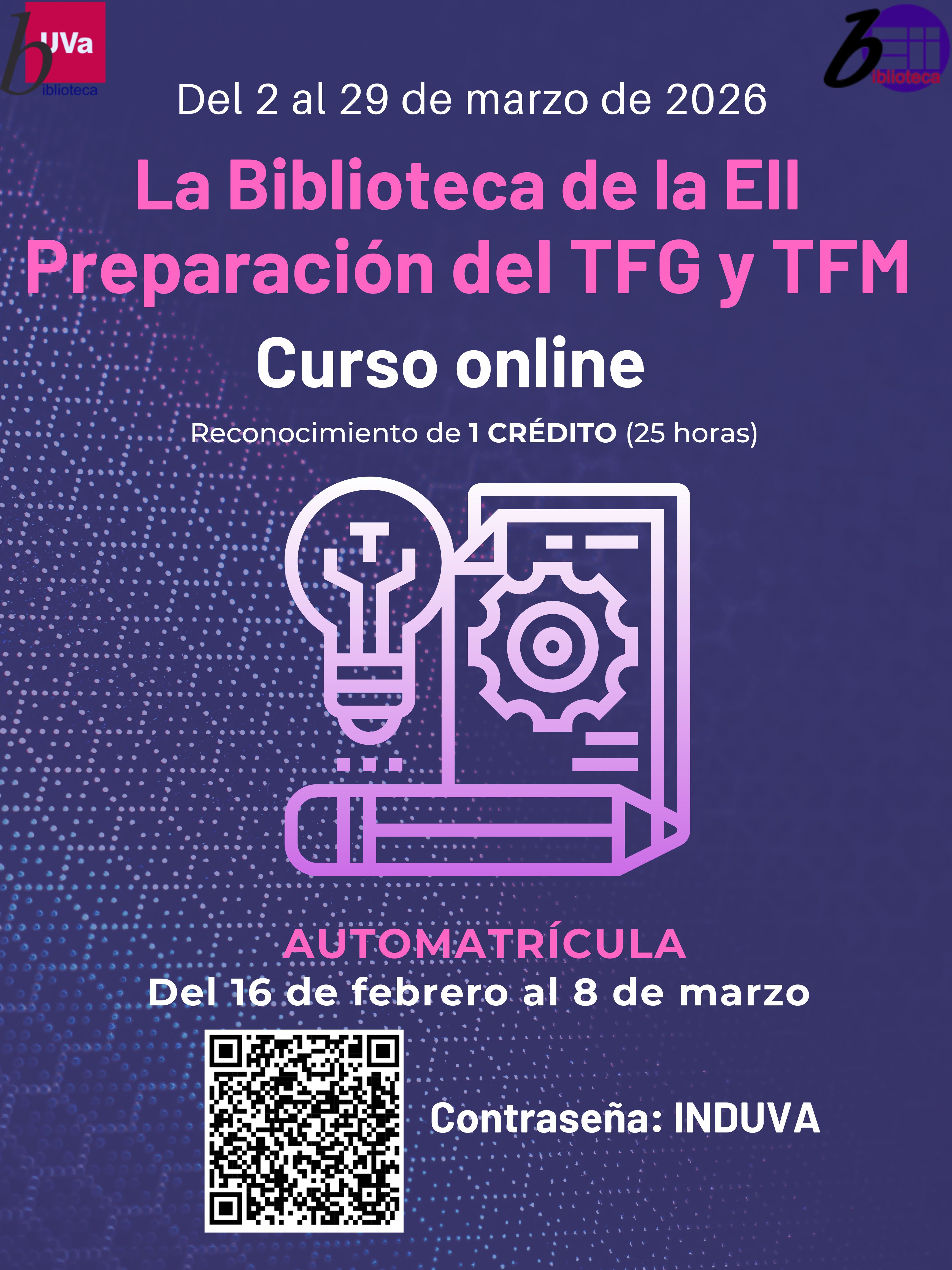 La Biblioteca de la Escuela de Ingenierías Industriales ofrece un curso online de 25 horas para la preparación del TFG-TFM, con matrícula del 16 de febrero al 8 de marzo. El curso incluye módulos sobre recursos bibliográficos y elaboración de trabajos académicos, con evaluación mediante actividades y test. Al finalizar, se otorga un certificado con un crédito reconocido.