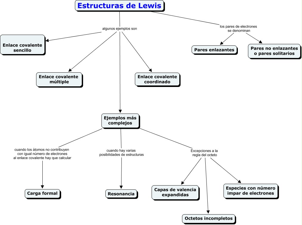 Lewis, Estructuras de Lewis algunos ejemplos son Enlace covalente coordinado, Ejemplos más complejos Excepciones a la regla del octeto Octetos incompletos, Estructuras de Lewis los pares de electrones se denominan Pares no enlazantes o pares solitarios, Estructuras de Lewis los pares de electrones se denominan Pares enlazantes, Ejemplos más complejos Excepciones a la regla del octeto Especies con número impar de electrones, Estructuras de Lewis algunos ejemplos son Enlace covalente sencillo, Estructuras de Lewis algunos ejemplos son Ejemplos más complejos, Ejemplos más complejos Excepciones a la regla del octeto Capas de valencia expandidas, Estructuras de Lewis algunos ejemplos son Enlace covalente múltiple, Ejemplos más complejos cuando los átomos no contribuyen con igual número de electrones al enlace covalente hay que calcular Carga formal