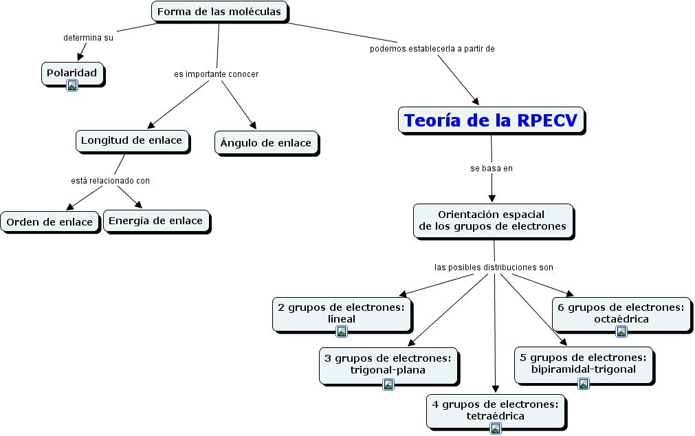 RPECV, Orientación espacial de los grupos de electrones las posibles distribuciones son 3 grupos de electrones: trigonal-plana, Orientación espacial de los grupos de electrones las posibles distribuciones son 2 grupos de electrones: lineal, Longitud de enlace está relacionado con Energía de enlace, Forma de las moléculas es importante conocer Ángulo de enlace, Forma de las moléculas podemos establecerla a partir de Teoría de la RPECV, Forma de las moléculas determina su Polaridad, Teoría de la RPECV se basa en Orientación espacial de los grupos de electrones, Longitud de enlace está relacionado con Orden de enlace, Orientación espacial de los grupos de electrones las posibles distribuciones son 4 grupos de electrones: tetraédrica, Forma de las moléculas es importante conocer Longitud de enlace