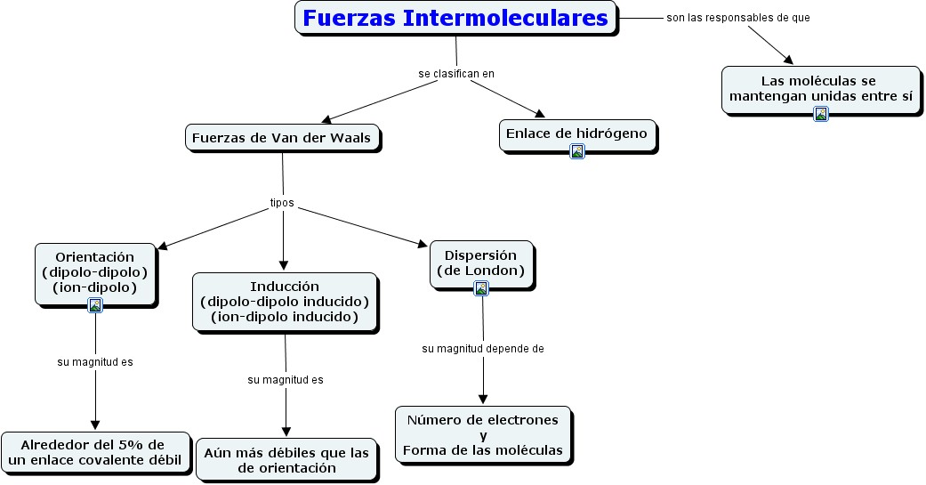 intermoleculares, Fuerzas Intermoleculares se clasifican en Fuerzas de Van der Waals, Dispersión (de London) su magnitud depende de Número de electrones y Forma de las moléculas, Orientación (dipolo-dipolo) (ion-dipolo) su magnitud es Alrededor del 5% de un enlace covalente débil, Fuerzas de Van der Waals tipos Orientación (dipolo-dipolo) (ion-dipolo), Fuerzas Intermoleculares son las responsables de que Las moléculas se mantengan unidas entre sí, Inducción (dipolo-dipolo inducido) (ion-dipolo inducido) su magnitud es Aún más débiles que las de orientación, Fuerzas de Van der Waals tipos Inducción (dipolo-dipolo inducido) (ion-dipolo inducido), Fuerzas Intermoleculares se clasifican en Enlace de hidrógeno, Fuerzas de Van der Waals tipos Dispersión (de London)